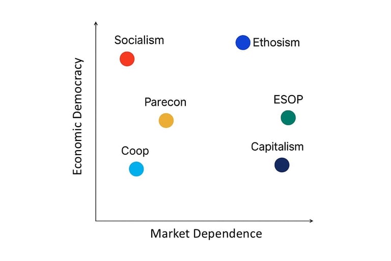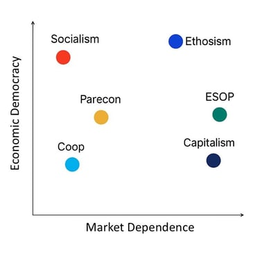 The six models along the dual axes of economic democracy and market dependence reveal the underlying tensions between collective governance and market imperatives. Socialism prioritizes democratic control with minimal market influence, often resulting in centralized planning, limited consumer choice, and inefficiencies in resource allocation. Capitalism, in contrast, relies heavily on markets with little democratic input, concentrating economic power, widening the wealth gap, and subjecting essential needs to profit-driven logic, often at the expense of environmental sustainability. Ethosism disrupts this opposition by combining high economic democracy with full market engagement; it remains profit-driven, but for all, redistributing decision-making and returns across the economic body rather than concentrating them at the top. Models like Parecon, cooperatives, and ESOPs occupy the middle ground, blending shared governance with selective market use, but often face trade-offs in scalability, operational efficiency, and consistent equity.