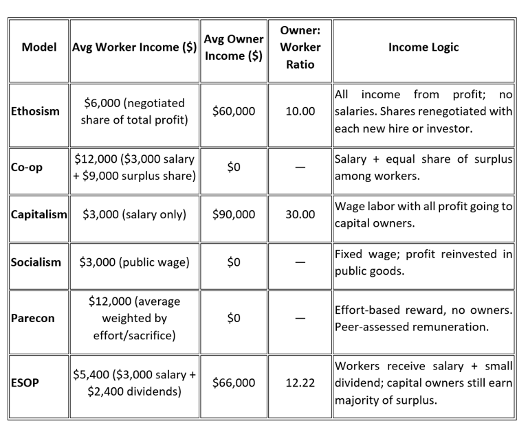 Some of these are full-fledged macroeconomic systems (Ethosism, Capitalism, Socialism, Parecon), while others operate as enterprise-level structures (Co-ops, ESOPs) embedded within broader regimes. Of these, Ethosism introduces the most structurally disruptive proposition: the elimination of salaries altogether in favor of a fully participatory and negotiated profit-sharing regime.