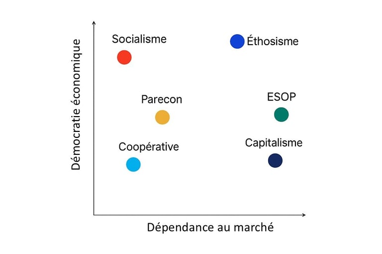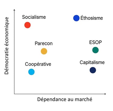 Les six modèles économiques et organisationnels, situés à l’intersection de la démocratie économique et de la dépendance au marché, révèlent les tensions profondes entre gouvernance collective et logiques marchandes. Le socialisme privilégie un contrôle démocratique avec une influence minimale du marché, ce qui conduit souvent à une planification centralisée, un choix limité pour les consommateurs et des inefficacités dans l’allocation des ressources. Le capitalisme, à l’inverse, repose fortement sur les marchés avec peu d’apport démocratique, concentrant le pouvoir économique, creusant les inégalités de richesse et soumettant les besoins essentiels à une logique de profit, souvent au détriment de la durabilité environnementale. L’éthosisme rompt avec cette opposition en combinant une forte démocratie économique avec une pleine intégration au marché ; il demeure orienté vers le profit, mais au bénéfice de tous, en redistribuant la prise de décision et les retours économiques à l’échelle de l’ensemble du corps économique, plutôt que de les concentrer au sommet. Le Parecon, les coopératives et les ESOP occupent une position intermédiaire, articulant une gouvernance partagée avec un usage sélectif du marché, mais affrontent souvent des compromis en matière de scalabilité, efficacité opérationnelle et équité constante.