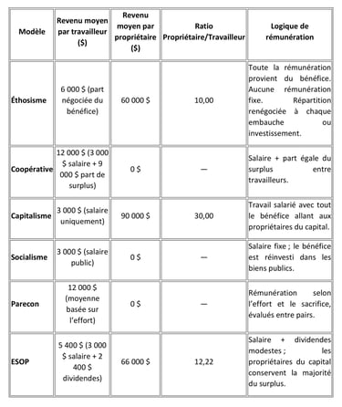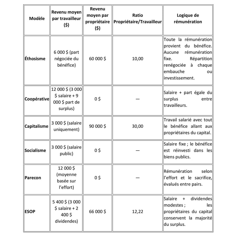 Logique de rémunération : Seuls l’éthosisme et le Parecon rompent complètement avec le salaire fixe. L’éthosisme repose sur un partage des profits négocié en fonction de la participation dynamique à la création de valeur. Le Parecon, quant à lui, lie la rémunération à l’effort perçu, évalué par les pairs, dans une logique de justice participative. Les autres modèles — capitalisme, coopératives, ESOP — conservent une structure hybride associant salaire fixe et dividendes.